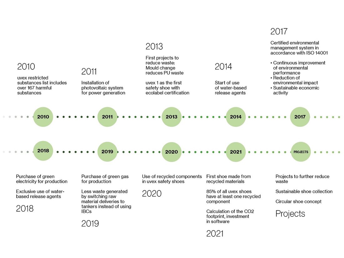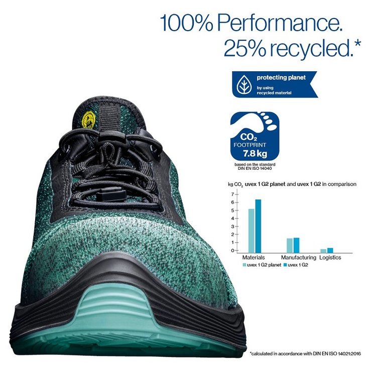For the first time, we have calculated the CO2 footprint for a uvex safety shoe. This tells us how much CO2 is emitted during the production of a pair. To calculate this, we measured the emissions from the raw materials to the first use**.