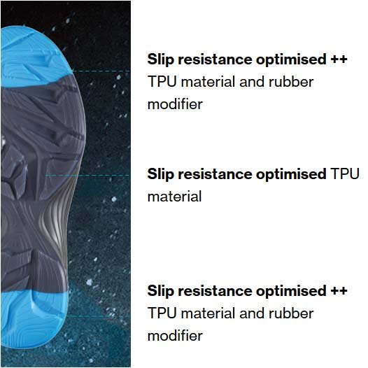 Based on a latest-generation TPU outsole, uvex x-tended grip technology guarantees even greater performance in terms of abrasion resistance and optimised slip resistance.