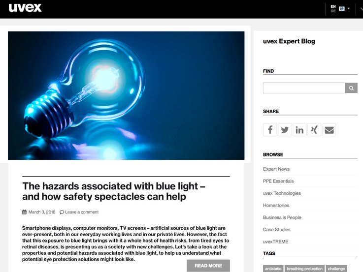 Wearing safety spectacles that reduce harmful blue light is recommended at workplaces with screens as well as for people who work in environments with glaring artificial light sources (LED lighting), as can sometimes be the case in light industry or certain logistics platforms.